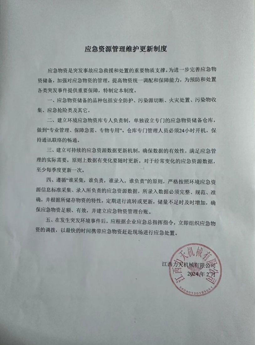 (2)保持突發(fā)環(huán)境污染事件應急專項資金庫資金充足。根據(jù)江西力天機械有限公司目前的實際情況,保持每年投資約5-8萬元,作為日后應急物資的更新儲備、應急預案的演練、突發(fā)環(huán)境事件搶險救援使用。